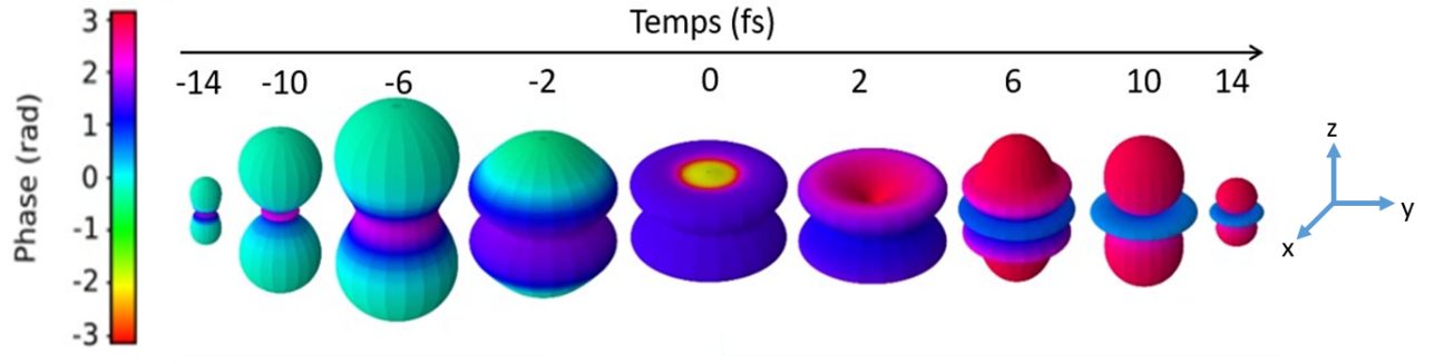 3D film of the photoemission of a helium atom following the simultaneous absorption of an extreme photon ultraviolet (Ultraviolet (UV) radiation is electromagnetic radiation with a length…) (XUV) and a photon (In particle physics, the photon (often symbolized by the letter γ — gamma)…) infrared (Infrared (IR) radiation is electromagnetic radiation with a wavelength…) (IR). L’moment (The instant designates the smallest constituent element of time. The instant is not…) t = 0 is placed at the maximum of the recovery (A covering of a set X is a set P of non-empty subsets of X such that the union…) XUV + IR pulses. Each snapshot represents the complex magnitude of the rate ofionization (Ionization is the action of removing or adding charges to an atom or a…) (module in polar coordinates (Polar coordinates are, in mathematics, a coordinate system…)phase data (In information technologies, a datum is an elementary description,…) by the color code). At the beginning and at the end of theinteraction (An interaction is an exchange of information, affects or energy between two agents within…)the emission of electrons takes place preferentially in the direction z of the polarization (the polarization of electromagnetic waves; the polarization due to moments…) XUV/IR. Remarkably, at the maximum of the interaction with light, near time 0, the interferences between the ionization pathways involving the 1s3p and 1s4p intermediate states strongly affect the symmetry (Generally the term symmetry refers to the existence, in a…) of the emission, which is then mostly perpendicular to the polarization of the radiation.